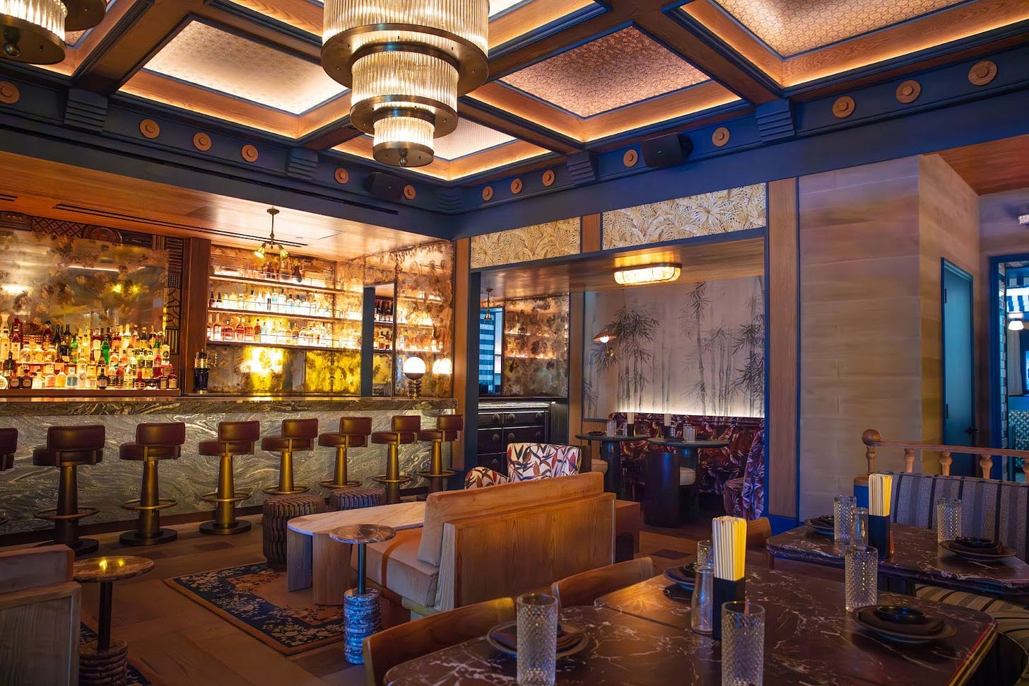 The Vibe: Deliberately dark and seductive. Warm brass sconces cast amber light over distressed mirror treatments, and rope-adorned fixtures allude to a nautical theme without laying it on too thick. A small host area opens to the bar, with a dining room sprawling beyond it.